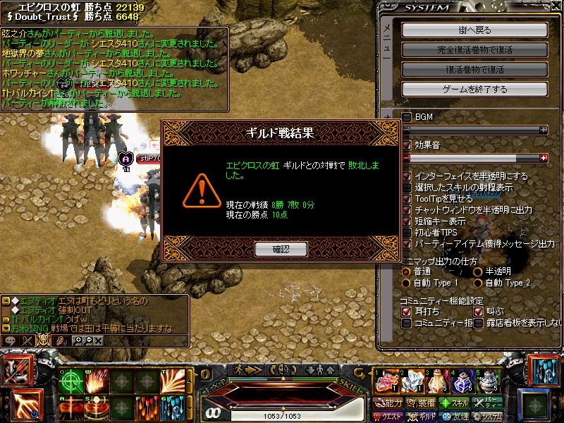 完全に指揮系統バラバラでみんなソロになってしまい烏合の衆に!ワタクシ不肖シエスタは巻物なんぞ持って来ていませんのでBISいなくなった時点でずっと青空見てました'(*´Д`*)・・・・あ、今shikixがバインド食らって・・死んだ・・・・ええええ!健康WIZなのに!死んでるぅぅぅ!まじかよ・・・。そんなレベルの戦いでした!地獄界の夢と†光†の悪魔コンビがアラクノ出して遊んでました・・・おまえら楽しそうだな、オイw( ^ω^)スカイプから二人の笑い声がずっと聞こえてました・・・楽しんでいて何よりです・・。死んだままGv終わって心臓が3列ほど鞄に余っていたのでGHでずっと心臓のやけ食い・・・ホト様のGv反省会・・・気付かなくてすいません><